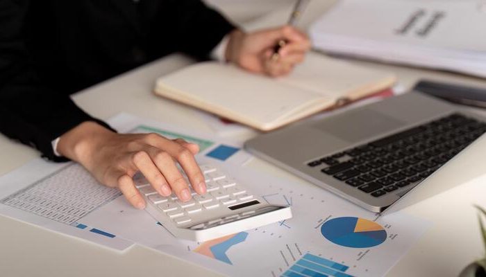 Consulting auditor analyzing Financial Report with Balance Sheet, Income Statement and Cash Flow information. Consultant auditing corporate finance and accounting. Business and operations management